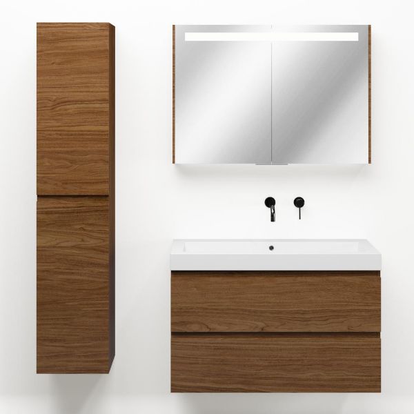 Greeploos badkamermeubel in de kleur warm noten is 100 cm breed.  De wastafel is vervaardig in polystone en heeft de kleur wit glans. Dit badkamermeubel met deze wastafel is leverbaar tussen de 60 cm t/m 200 cm