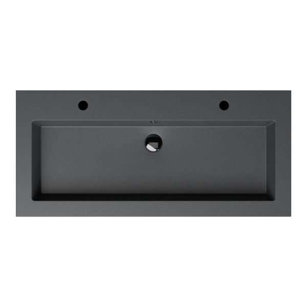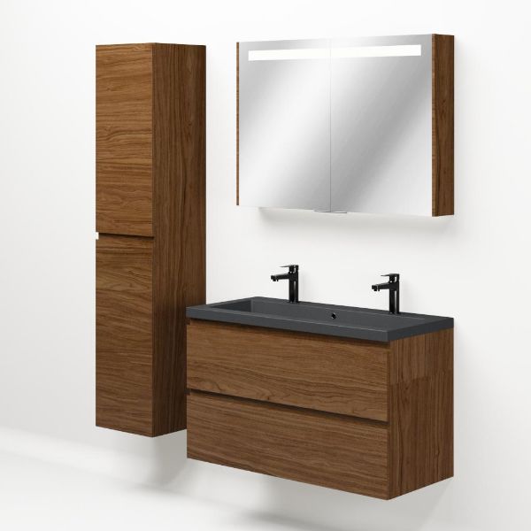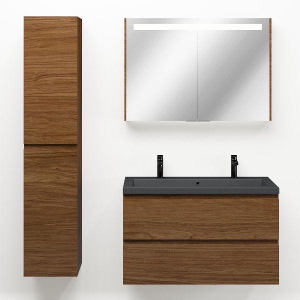 Greeploos badkamermeubel in de kleur warm noten is 100 cm breed.  De wastafel is vervaardig in quartz en heeft de kleur grijs mat. Dit badkamermeubel met deze wastafel is leverbaar tussen de 60 cm t/m 200 cm