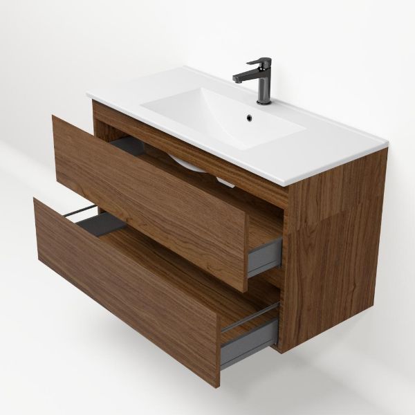 Bellanti Elena/Faro badmeubel 100x46 2 softclose laden warm noten greeploos keramische wastafel wit met 1 kraangat