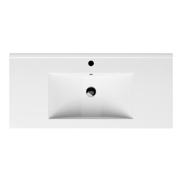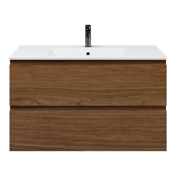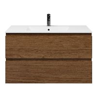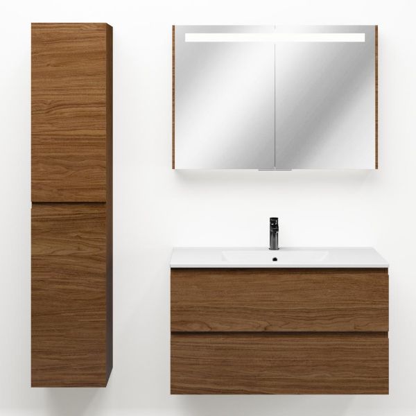Greeploos badkamermeubel in de kleur warm noten is 100 cm breed.  De wastafel is vervaardig in keramiek en heeft de kleur wit glans. Dit badkamermeubel met deze wastafel is leverbaar tussen de 60 cm t/m 120 cm