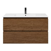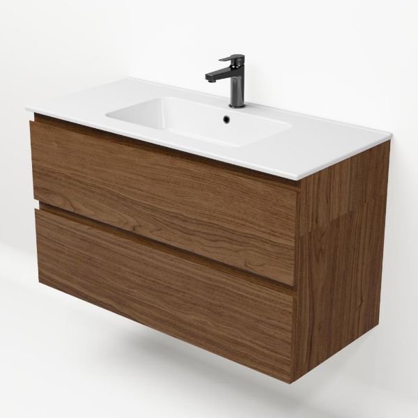 Greeploos badkamermeubel in de kleur warm noten is 100 cm breed.  De wastafel is vervaardig in keramiek en heeft de kleur wit glans. Dit badkamermeubel met deze wastafel is leverbaar tussen de 60 cm t/m 120 cm