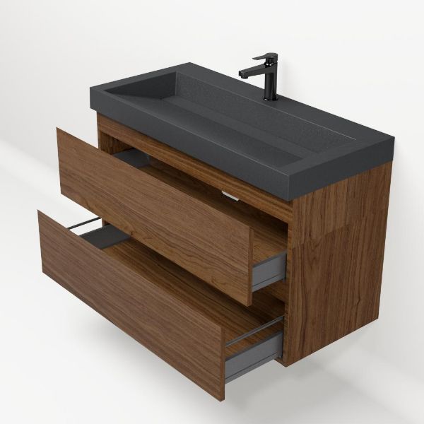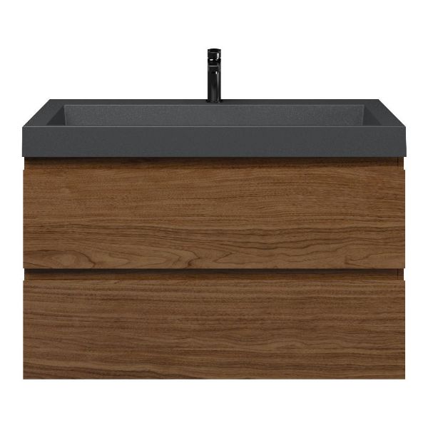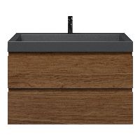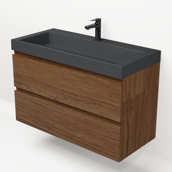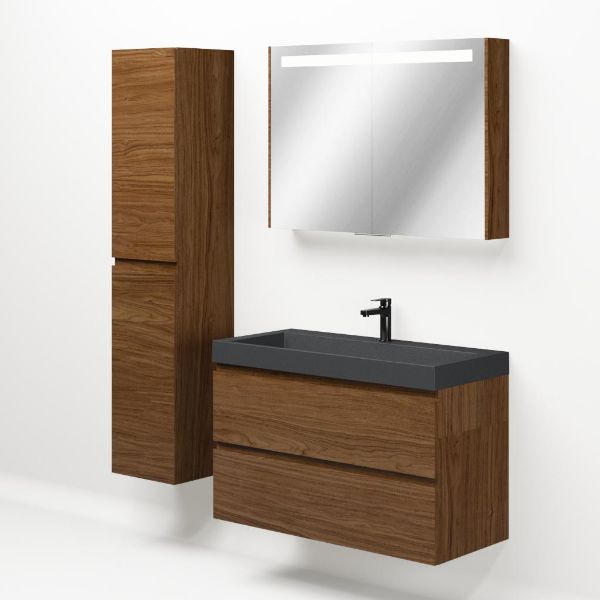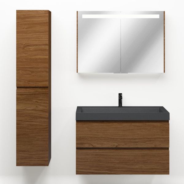 Greeploos badkamermeubel in de kleur warm noten is 100 cm breed.  De wastafel is vervaardig in polystone en heeft de kleur grijs mat. Dit badkamermeubel met deze wastafel is leverbaar tussen de 60 cm t/m 200 cm