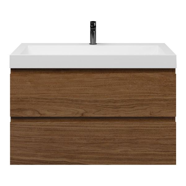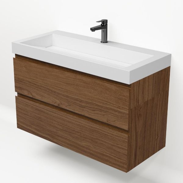 Greeploos badkamermeubel in de kleur warm noten is 100 cm breed.  De wastafel is vervaardig in quartz en heeft de kleur wit mat. Dit badkamermeubel met deze wastafel is leverbaar tussen de 60 cm t/m 200 cm