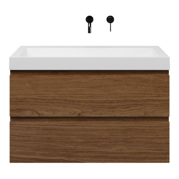 Greeploos badkamermeubel in de kleur warm noten is 100 cm breed.  De wastafel is vervaardig in quartz en heeft de kleur wit mat. Dit badkamermeubel met deze wastafel is leverbaar tussen de 60 cm t/m 200 cm