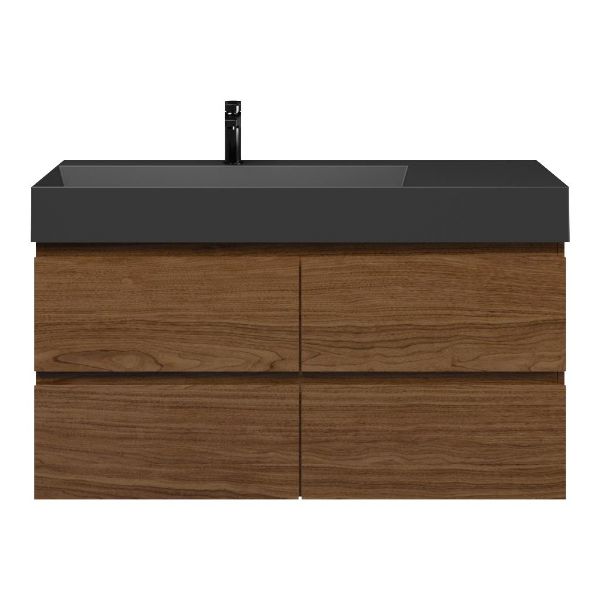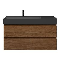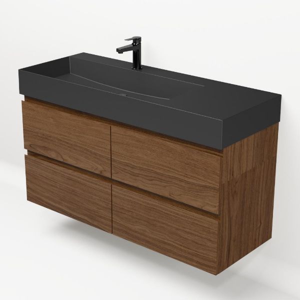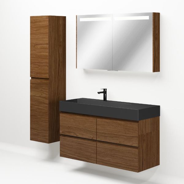 Greeploos badkamermeubel in de kleur warm noten is 120 cm breed.  De wastafel is vervaardig in keramiek en heeft de kleur zwart mat. Dit badkamermeubel met deze wastafel is leverbaar tussen de 60 cm t/m 120 cm