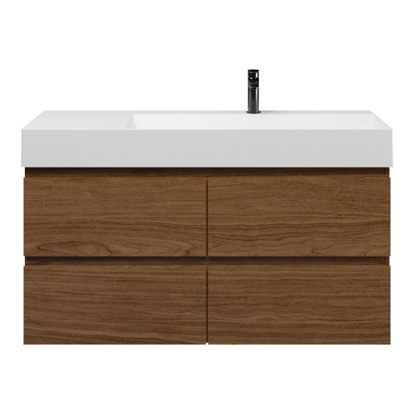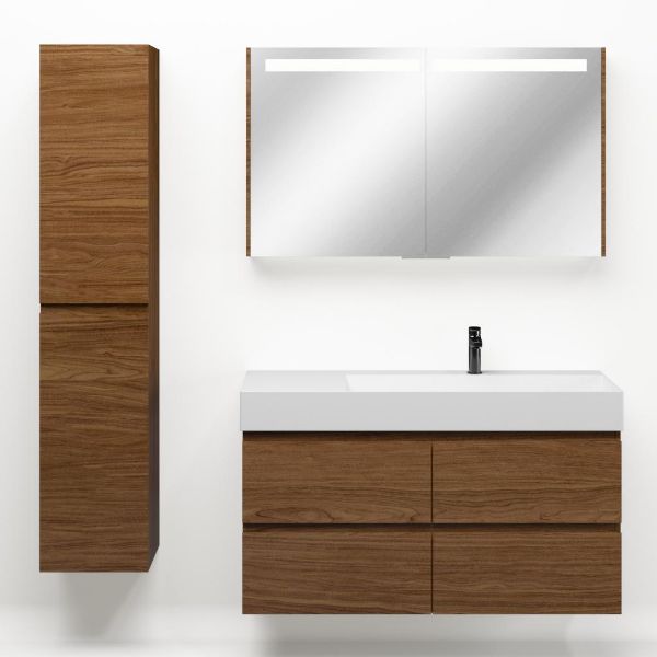 Greeploos badkamermeubel in de kleur warm noten is 120 cm breed.  De wastafel is vervaardig in keramiek en heeft de kleur wit mat. Dit badkamermeubel met deze wastafel is leverbaar tussen de 60 cm t/m 120 cm