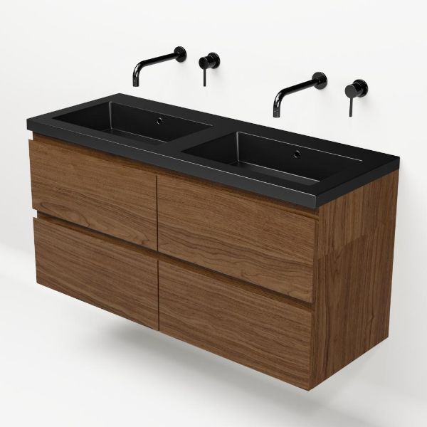 Bellanti Elena/Esta badmeubel 120x46 4 softclose laden warm noten greeploos polystone wastafel dubbel mat zwart zonder kraangaten