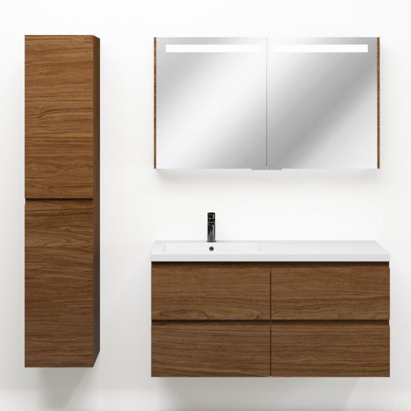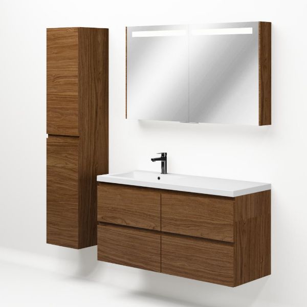 Greeploos badkamermeubel in de kleur warm noten is 120 cm breed.  De wastafel is vervaardig in polystone en heeft de kleur wit glans. Dit badkamermeubel met deze wastafel is leverbaar tussen de 60 cm t/m 200 cm