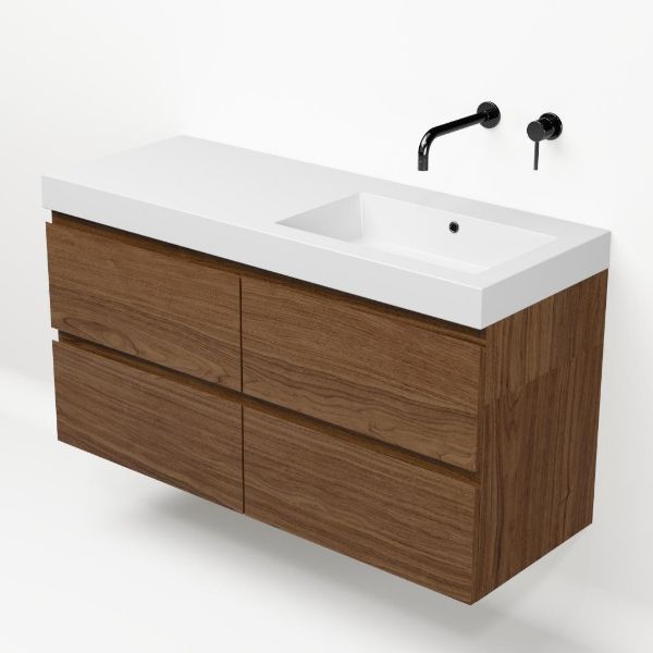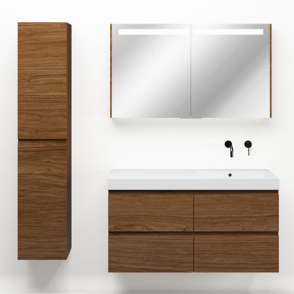 Greeploos badkamermeubel in de kleur warm noten is 120 cm breed.  De wastafel is vervaardig in polystone en heeft de kleur wit glans. Dit badkamermeubel met deze wastafel is leverbaar tussen de 60 cm t/m 200 cm