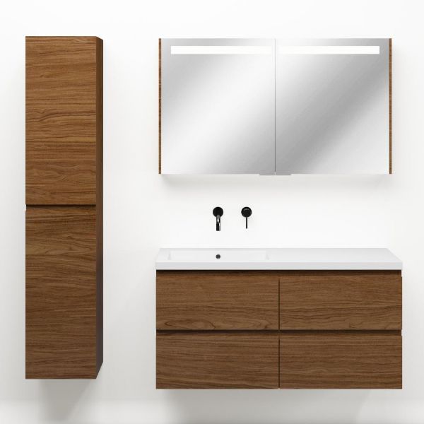 Greeploos badkamermeubel in de kleur warm noten is 120 cm breed.  De wastafel is vervaardig in polystone en heeft de kleur wit glans. Dit badkamermeubel met deze wastafel is leverbaar tussen de 60 cm t/m 200 cm