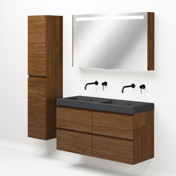 Greeploos badkamermeubel in de kleur warm noten is 120 cm breed.  De wastafel is vervaardig in quartz en heeft de kleur grijs mat. Dit badkamermeubel met deze wastafel is leverbaar tussen de 60 cm t/m 200 cm
