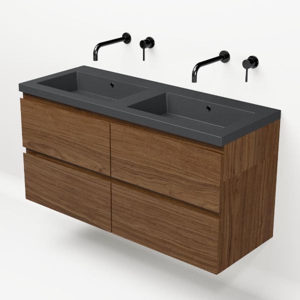 Greeploos badkamermeubel in de kleur warm noten is 120 cm breed.  De wastafel is vervaardig in quartz en heeft de kleur grijs mat. Dit badkamermeubel met deze wastafel is leverbaar tussen de 60 cm t/m 200 cm