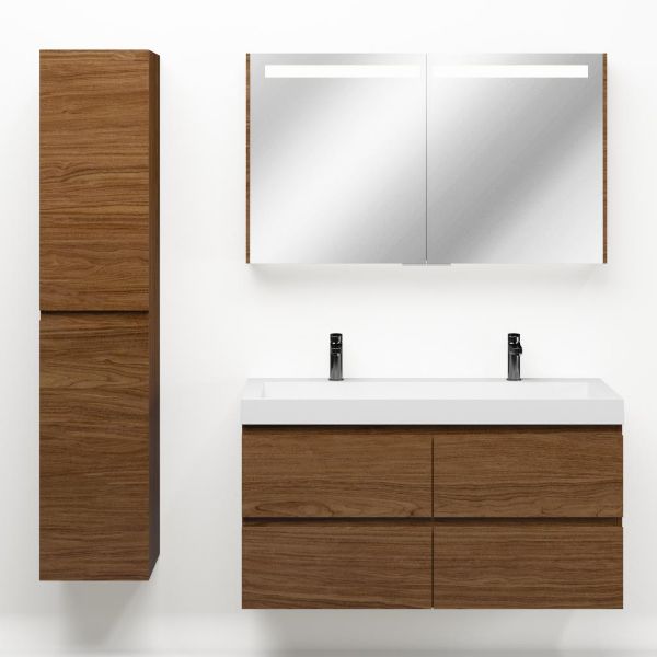 Greeploos badkamermeubel in de kleur warm noten is 120 cm breed.  De wastafel is vervaardig in polystone en heeft de kleur wit glans. Dit badkamermeubel met deze wastafel is leverbaar tussen de 60 cm t/m 200 cm