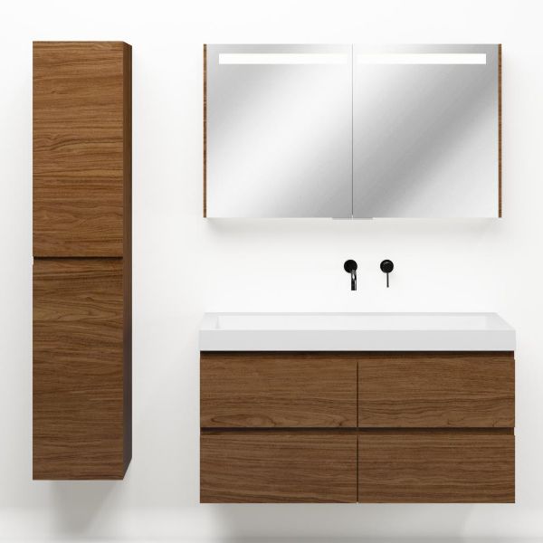Greeploos badkamermeubel in de kleur warm noten is 120 cm breed.  De wastafel is vervaardig in polystone en heeft de kleur wit glans. Dit badkamermeubel met deze wastafel is leverbaar tussen de 60 cm t/m 200 cm
