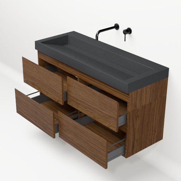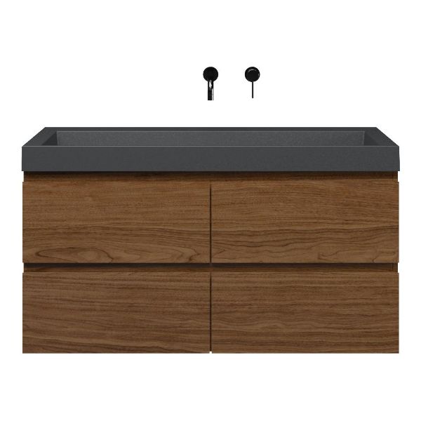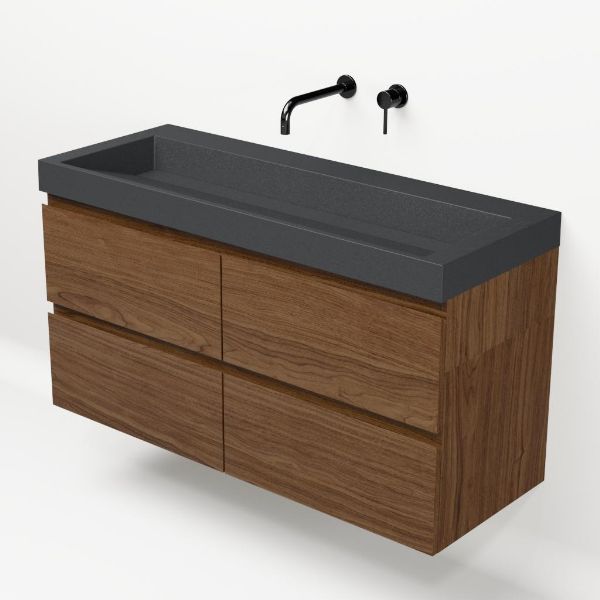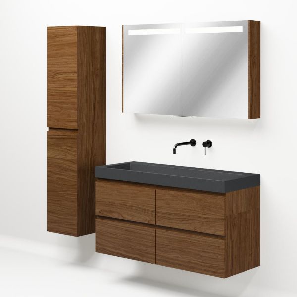 Greeploos badkamermeubel in de kleur warm noten is 120 cm breed.  De wastafel is vervaardig in quartz en heeft de kleur grijs mat. Dit badkamermeubel met deze wastafel is leverbaar tussen de 60 cm t/m 200 cm