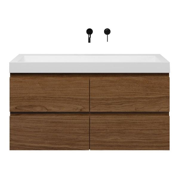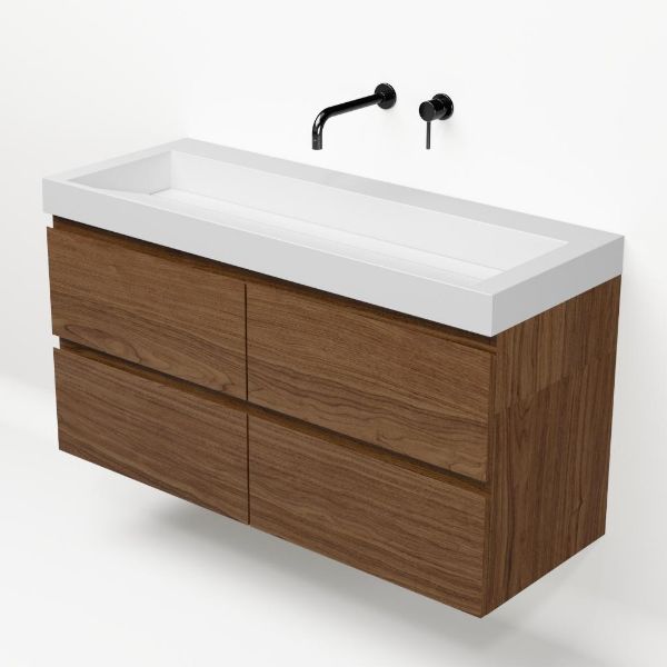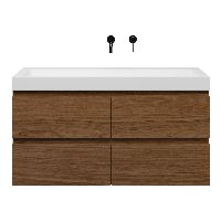 Greeploos badkamermeubel in de kleur warm noten is 120 cm breed.  De wastafel is vervaardig in polystone en heeft de kleur wit mat. Dit badkamermeubel met deze wastafel is leverbaar tussen de 60 cm t/m 200 cm