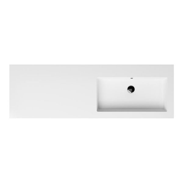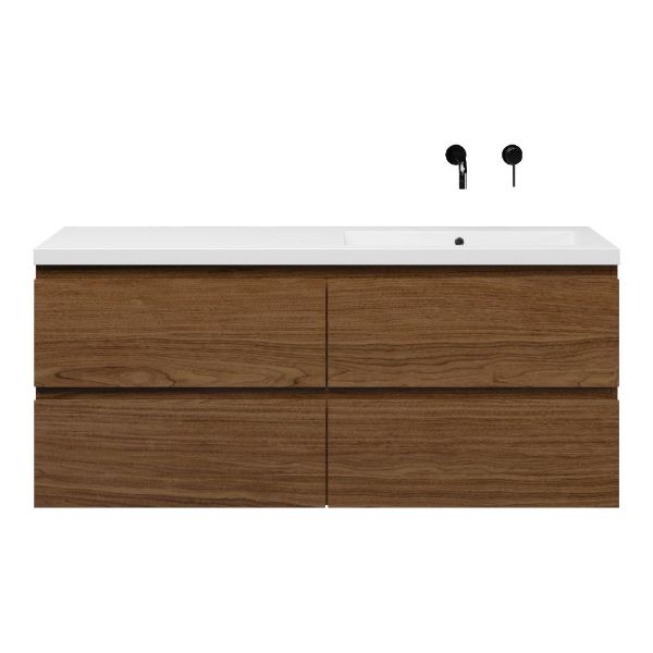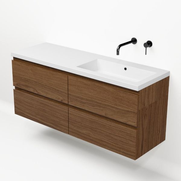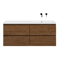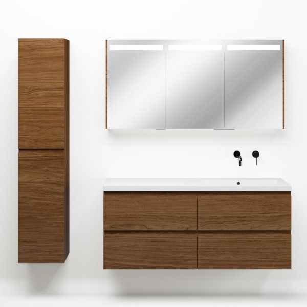 Greeploos badkamermeubel in de kleur warm noten is 140 cm breed.  De wastafel is vervaardig in polystone en heeft de kleur wit glans. Dit badkamermeubel met deze wastafel is leverbaar tussen de 60 cm t/m 200 cm