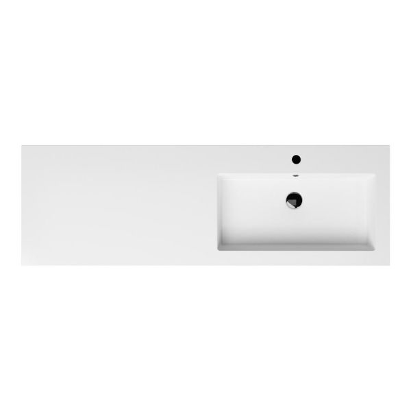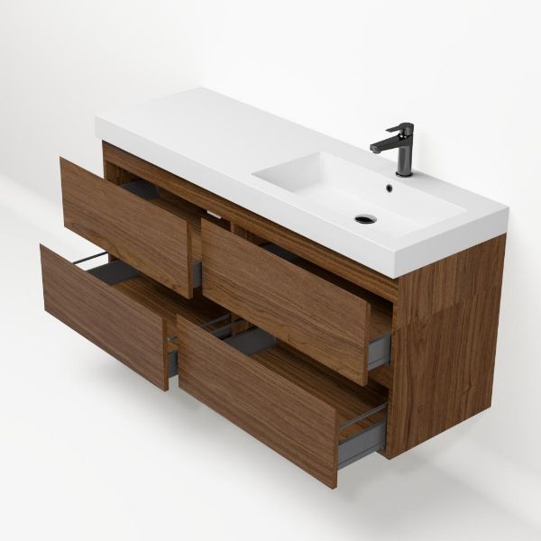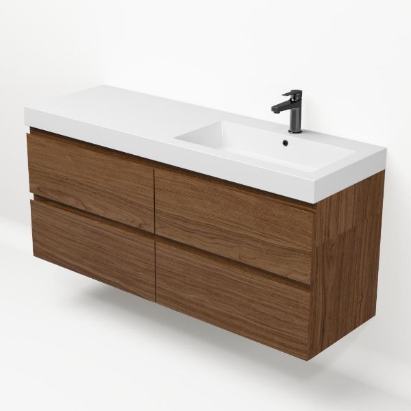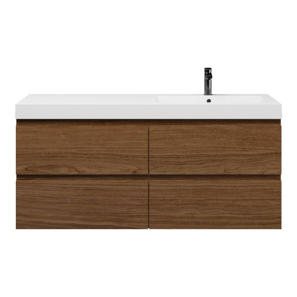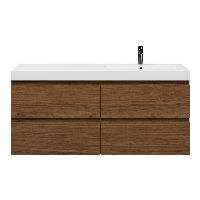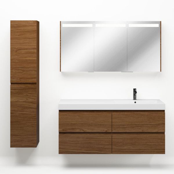 Greeploos badkamermeubel in de kleur warm noten is 140 cm breed.  De wastafel is vervaardig in polystone en heeft de kleur wit glans. Dit badkamermeubel met deze wastafel is leverbaar tussen de 60 cm t/m 200 cm