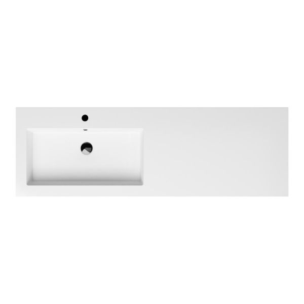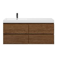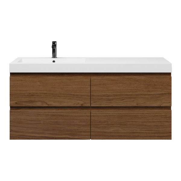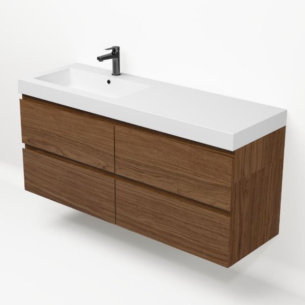 Greeploos badkamermeubel in de kleur warm noten is 140 cm breed.  De wastafel is vervaardig in polystone en heeft de kleur wit glans. Dit badkamermeubel met deze wastafel is leverbaar tussen de 60 cm t/m 200 cm