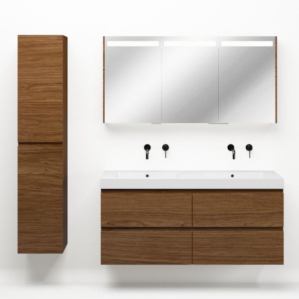 Greeploos badkamermeubel in de kleur warm noten is 140 cm breed.  De wastafel is vervaardig in polystone en heeft de kleur wit glans. Dit badkamermeubel met deze wastafel is leverbaar tussen de 60 cm t/m 200 cm
