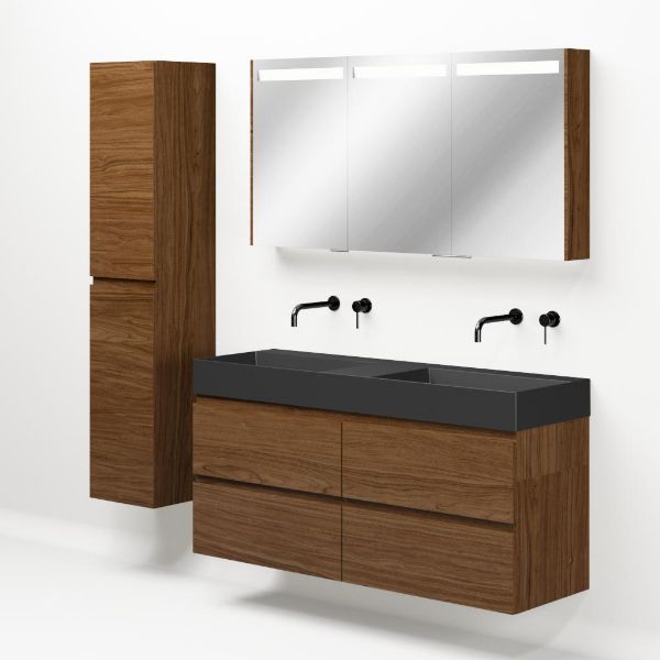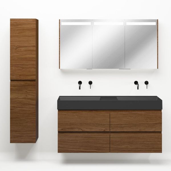 Greeploos badkamermeubel in de kleur warm noten is 140 cm breed.  De wastafel is vervaardig in keramiek en heeft de kleur zwart mat. Dit badkamermeubel met deze wastafel is leverbaar tussen de 60 cm t/m 120 cm