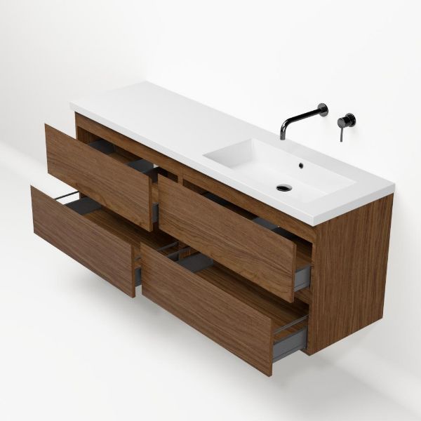 Bellanti Elena/Esta badmeubel 160x46 4 softclose laden warm noten greeploos polystone enkele wastafel rechts wit zonder kraangat