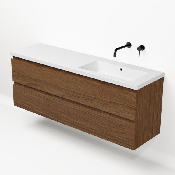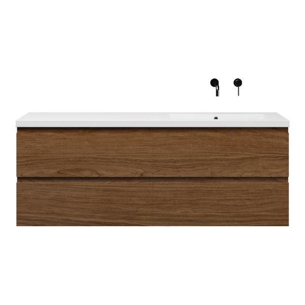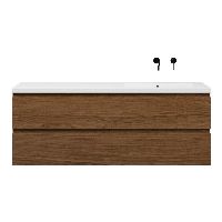Greeploos badkamermeubel in de kleur warm noten is 160 cm breed.  De wastafel is vervaardig in polystone en heeft de kleur wit glans. Dit badkamermeubel met deze wastafel is leverbaar tussen de 60 cm t/m 200 cm
