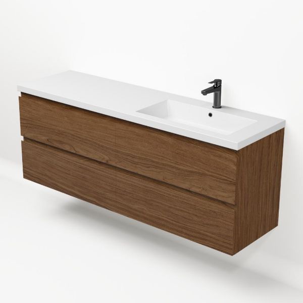 Greeploos badkamermeubel in de kleur warm noten is 160 cm breed.  De wastafel is vervaardig in polystone en heeft de kleur wit glans. Dit badkamermeubel met deze wastafel is leverbaar tussen de 60 cm t/m 200 cm
