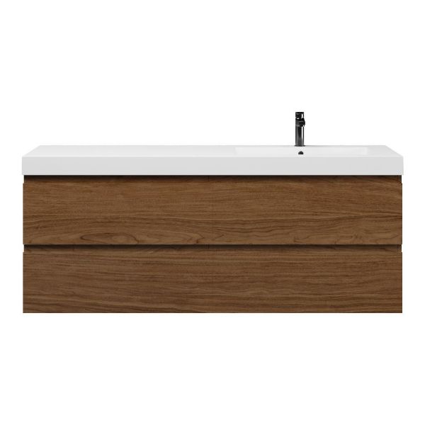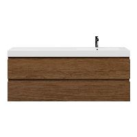 Greeploos badkamermeubel in de kleur warm noten is 160 cm breed.  De wastafel is vervaardig in polystone en heeft de kleur wit glans. Dit badkamermeubel met deze wastafel is leverbaar tussen de 60 cm t/m 200 cm