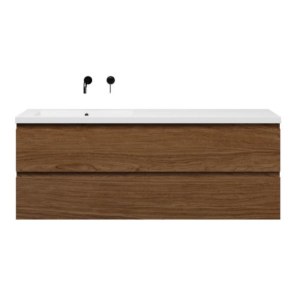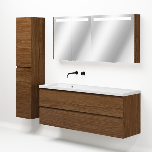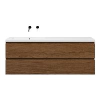 Greeploos badkamermeubel in de kleur warm noten is 160 cm breed.  De wastafel is vervaardig in polystone en heeft de kleur wit glans. Dit badkamermeubel met deze wastafel is leverbaar tussen de 60 cm t/m 200 cm
