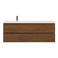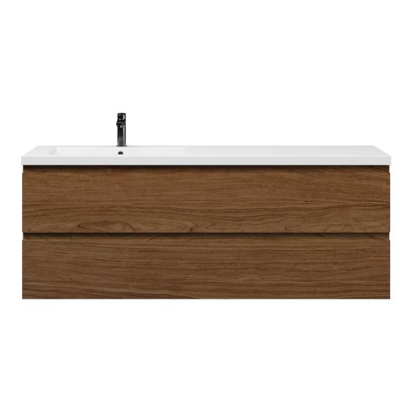 Greeploos badkamermeubel in de kleur warm noten is 160 cm breed.  De wastafel is vervaardig in polystone en heeft de kleur wit glans. Dit badkamermeubel met deze wastafel is leverbaar tussen de 60 cm t/m 200 cm