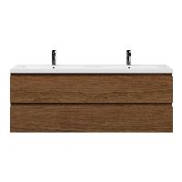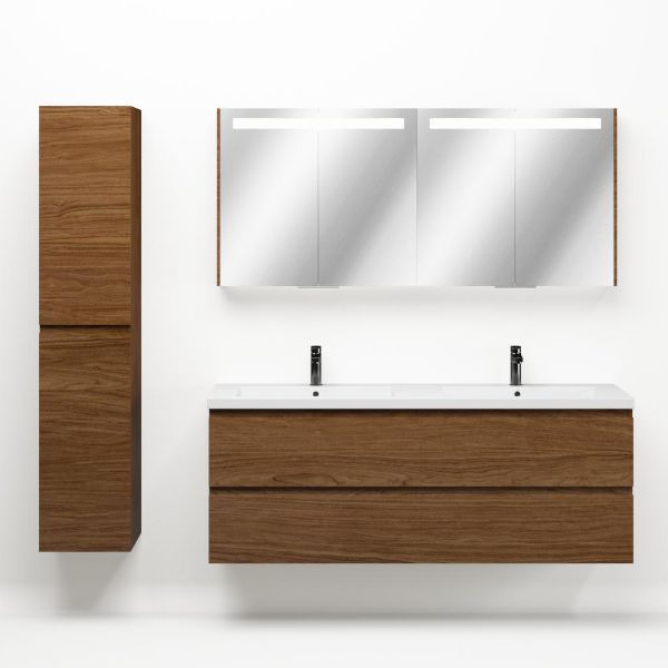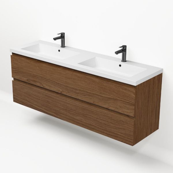 Greeploos badkamermeubel in de kleur warm noten is 160 cm breed.  De wastafel is vervaardig in polystone en heeft de kleur wit glans. Dit badkamermeubel met deze wastafel is leverbaar tussen de 60 cm t/m 200 cm