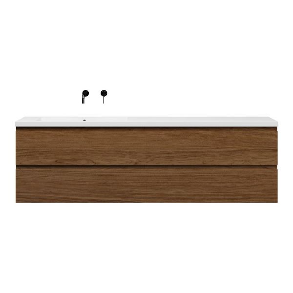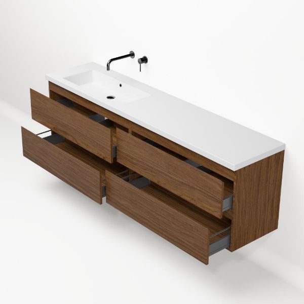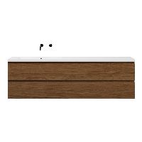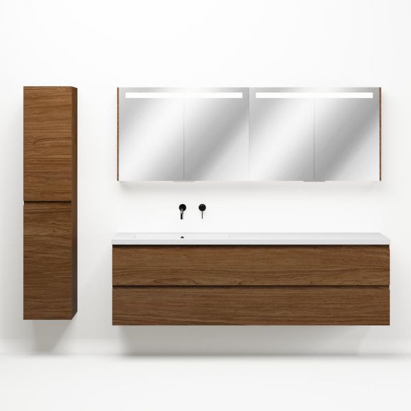 Greeploos badkamermeubel in de kleur warm noten is 200 cm breed.  De wastafel is vervaardig in polystone en heeft de kleur wit glans. Dit badkamermeubel met deze wastafel is leverbaar tussen de 60 cm t/m 200 cm