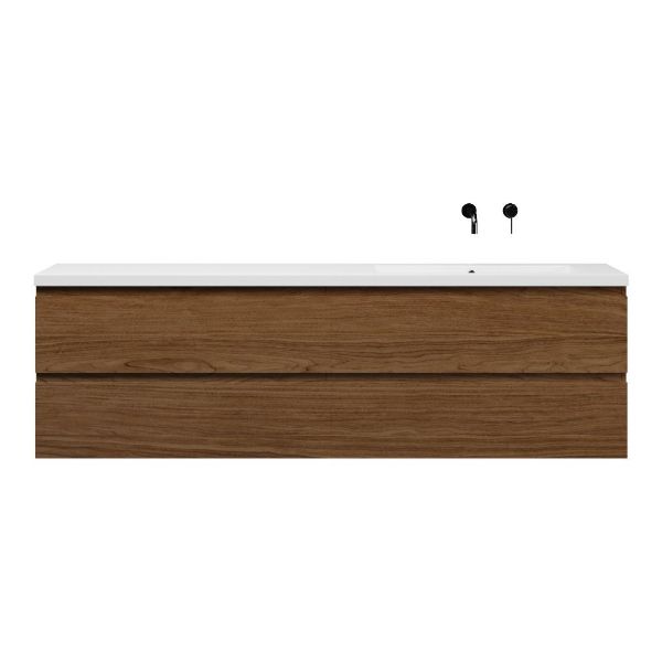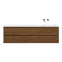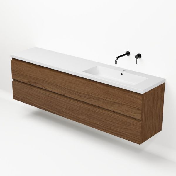Greeploos badkamermeubel in de kleur warm noten is 200 cm breed.  De wastafel is vervaardig in polystone en heeft de kleur wit glans. Dit badkamermeubel met deze wastafel is leverbaar tussen de 60 cm t/m 200 cm