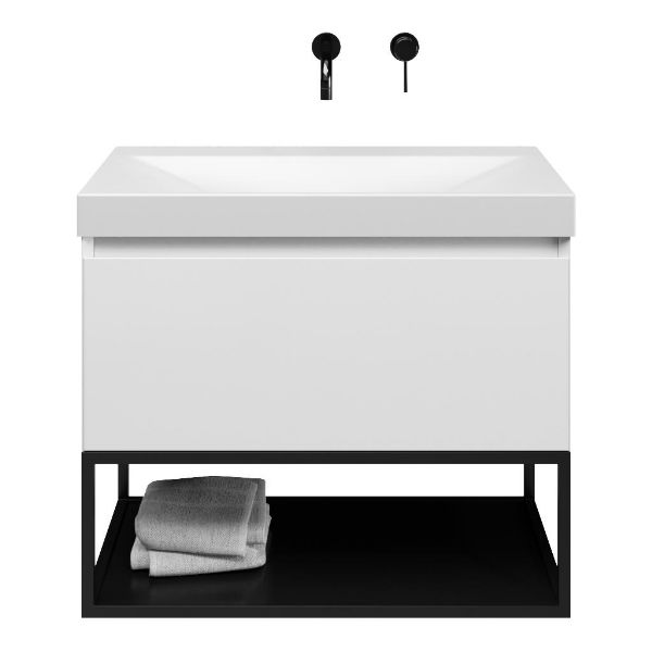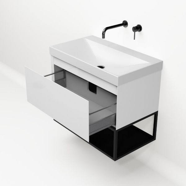 Bellanti Solo/Tela/Jenthe badmeubel 80x46 1 softclose lade wit hoogglans greeploos keramische wastafel wit mat zonder kraangaten met mat zwart metalen frame