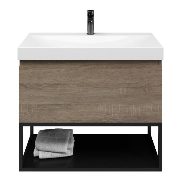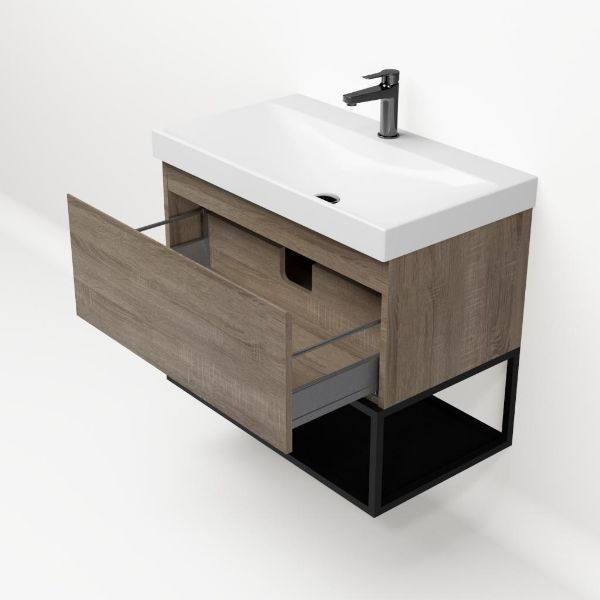 Bellanti Solo/Tela/Jenthe badmeubel 80x46 1 softclose lade eiken donker greeploos keramische wastafel wit glans met 1 kraangat met mat zwart metalen frame