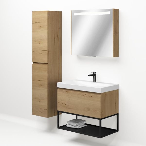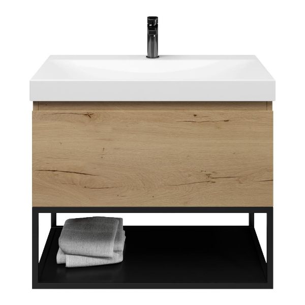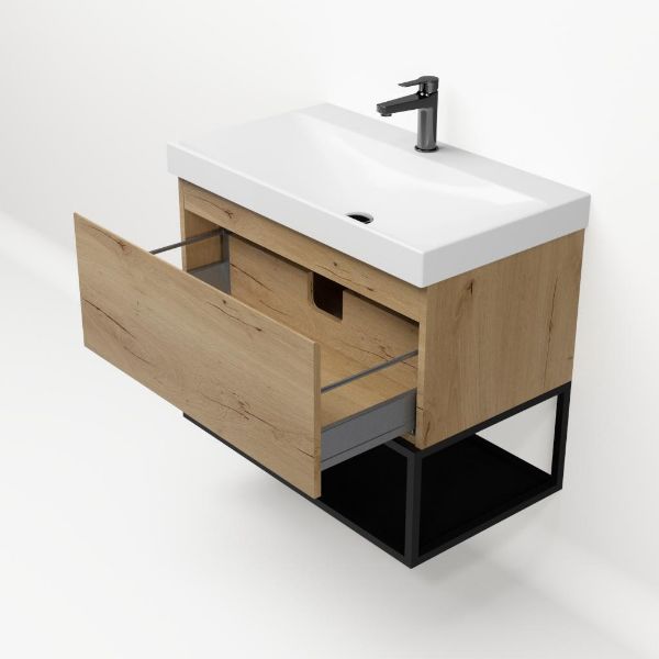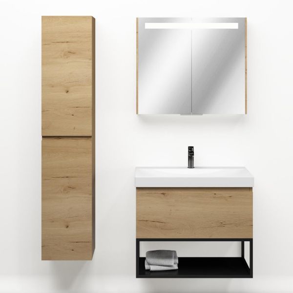 Bellanti Solo/Tela/Jenthe badmeubel 80x46 1 softclose lade eiken natuur greeploos keramische wastafel wit glans met 1 kraangat met mat zwart metalen frame