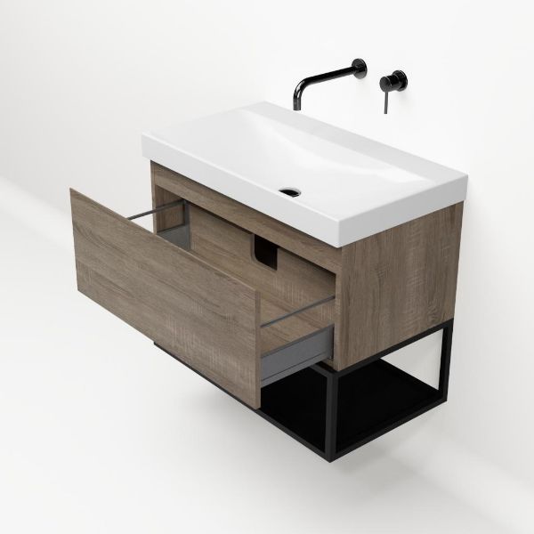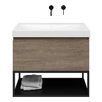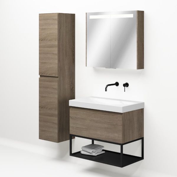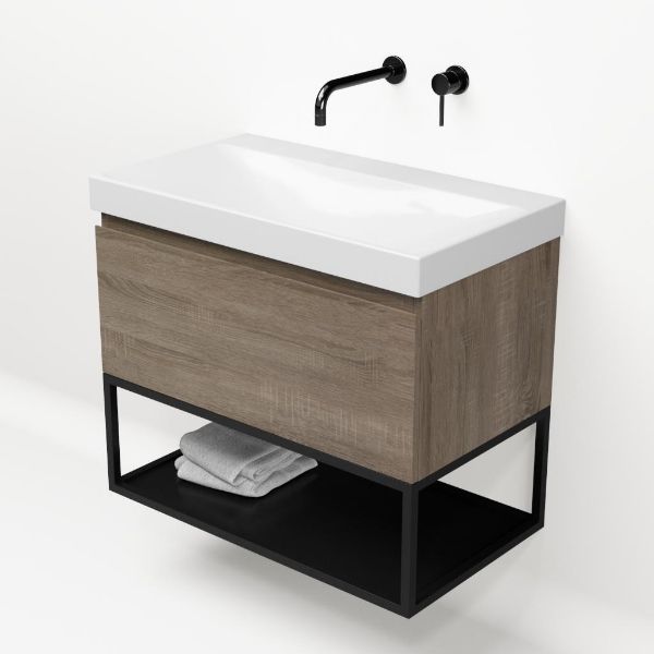 | | Bellanti Solo/Tela/Jenthe badmeubel 80x46 1 softclose lade eiken donker greeploos keramische wastafel wit glans zonder kraangaten met mat zwart metalen frame |