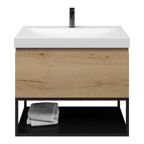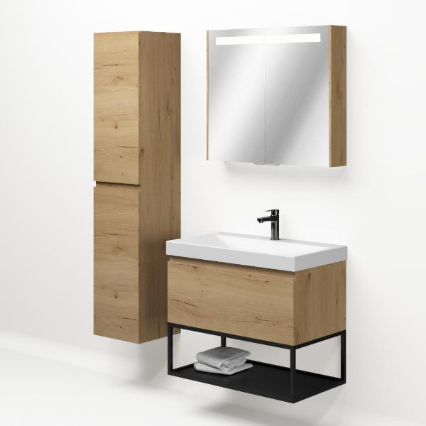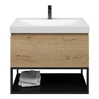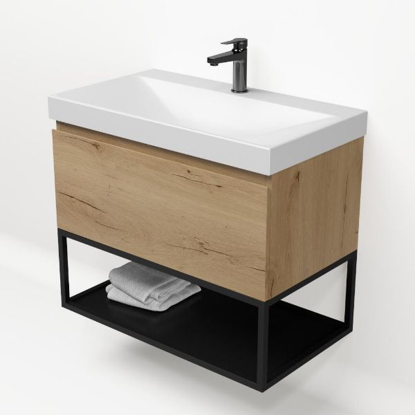 | | Bellanti Solo/Tela/Jenthe badmeubel 80x46 1 softclose lade eiken natuur greeploos keramische wastafel wit glans mat 1 kraangat met mat zwart metalen frame |