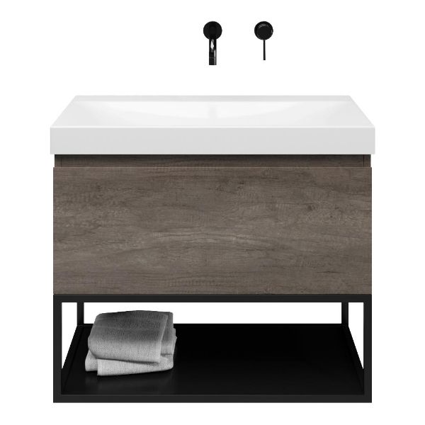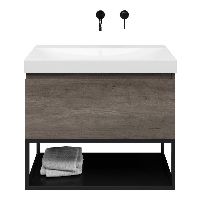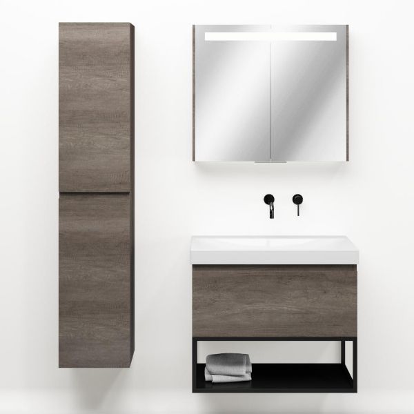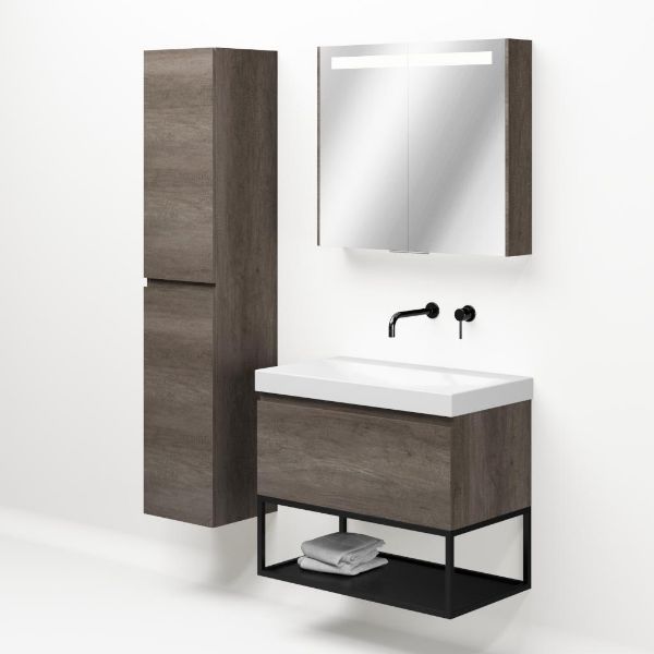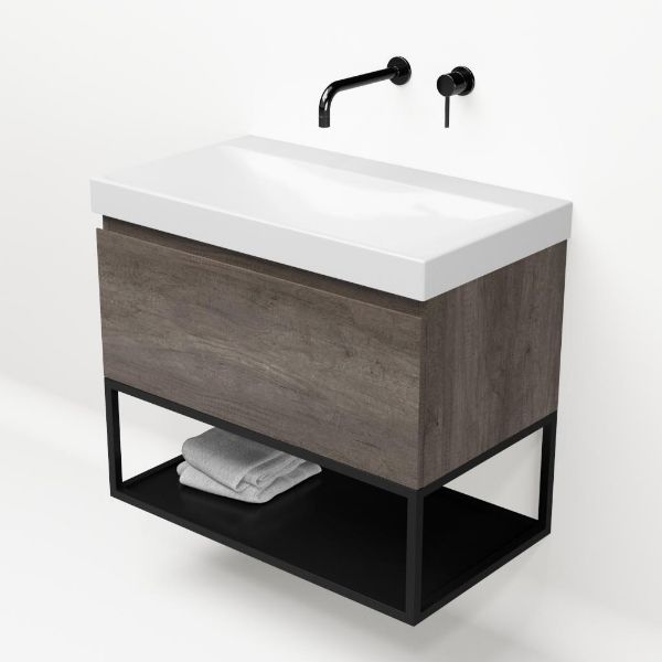 | | Bellanti Solo/Tela/Jenthe badmeubel 80x46 1 softclose lade olm donker grijs greeploos keramische wastafel wit glans zonder kraangaten met mat zwart metalen frame |