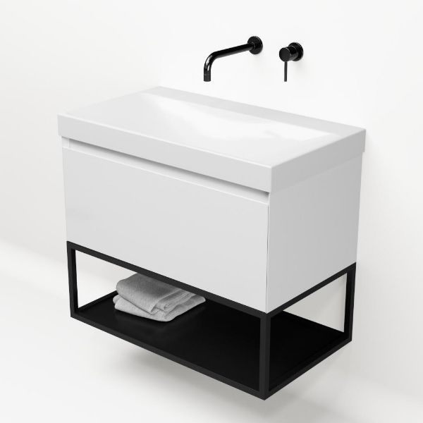 | | Bellanti Solo/Tela/Jenthe badmeubel 80x46 1 softclose lade wit hoogglans greeploos keramische wastafel wit glans zonder kraangaten met mat zwart metalen frame |