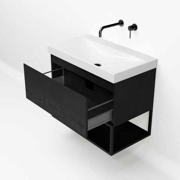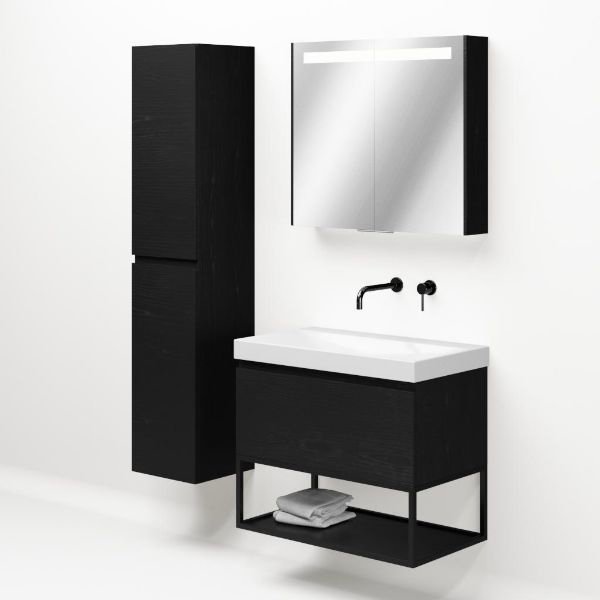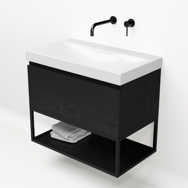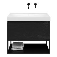 | | Bellanti Solo/Tela/Jenthe badmeubel 80x46 1 softclose lade mat zwart eiken greeploos keramische wastafel wit glans zonder kraangaten met mat zwart metalen frame |