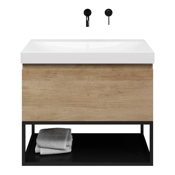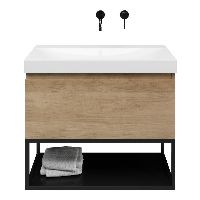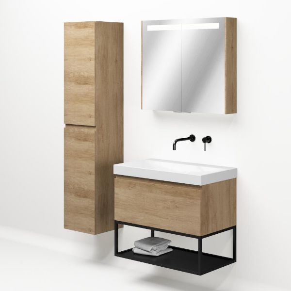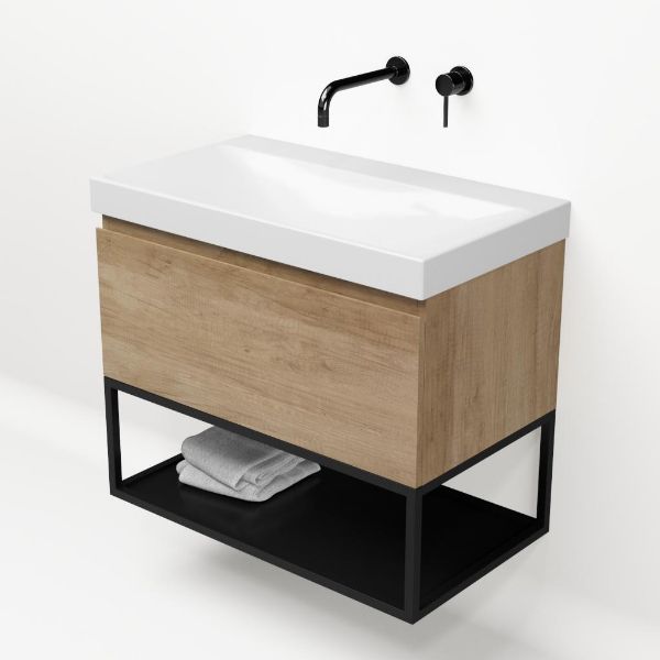 | | Bellanti Solo/Tela/Jenthe badmeubel 80x46 1 softclose lade olm greeploos keramische wastafel wit glans zonder kraangaten met mat zwart metalen frame |