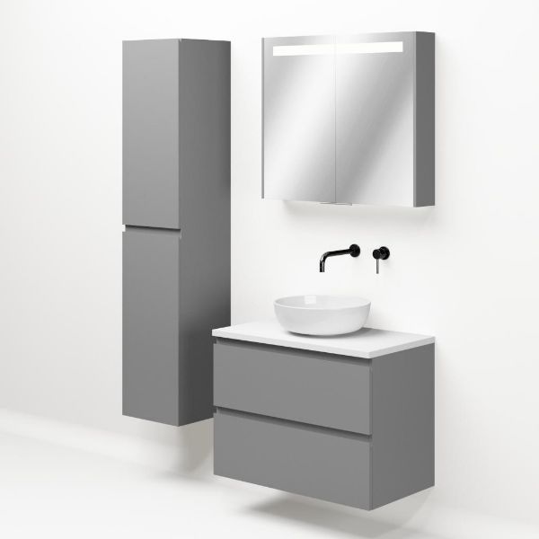 Greeploos badkamermeubel in de kleur licht grijs mat is 80 cm breed. Op het meubel ligt een afdekplaat met een gelamineerde toplaag of volledig gemaakt van natuursteen.