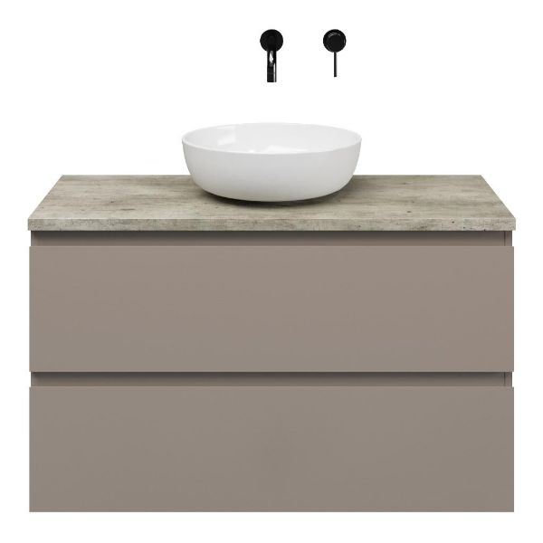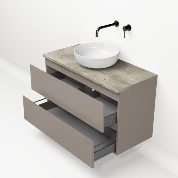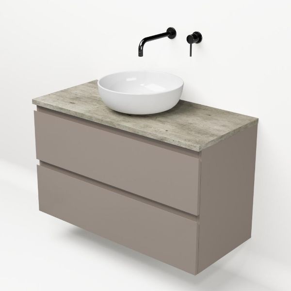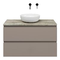 Greeploos badkamermeubel in de kleur taupe is 100 cm breed. Op het meubel ligt een afdekplaat met een gelamineerde toplaag of volledig gemaakt van natuursteen.