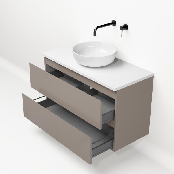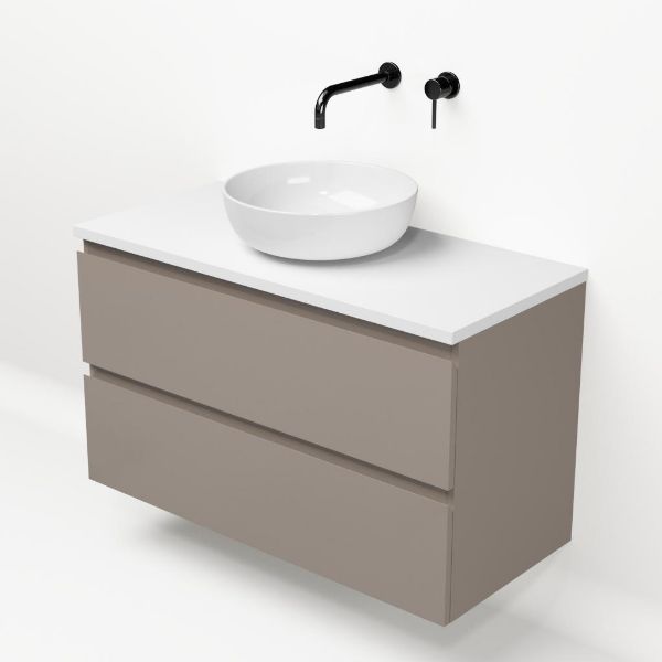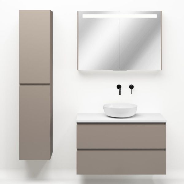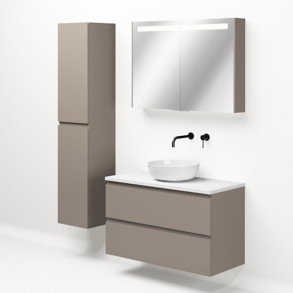 Greeploos badkamermeubel in de kleur taupe is 100 cm breed. Op het meubel ligt een afdekplaat met een gelamineerde toplaag of volledig gemaakt van natuursteen.