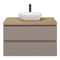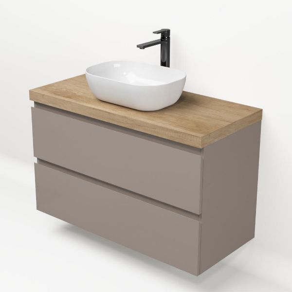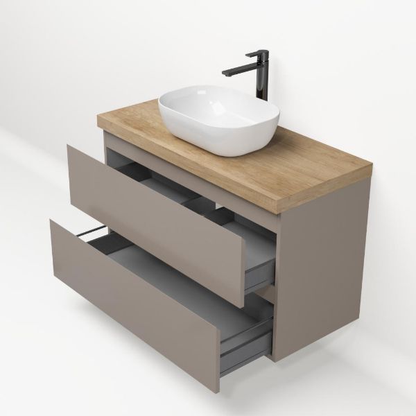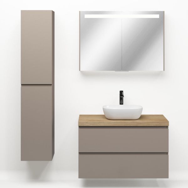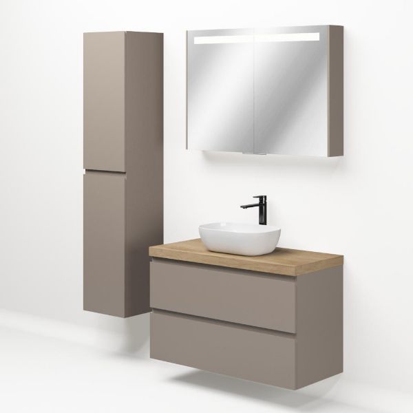 Greeploos badkamermeubel in de kleur taupe is 100 cm breed. Op het meubel ligt een afdekplaat met een gelamineerde toplaag of volledig gemaakt van natuursteen.