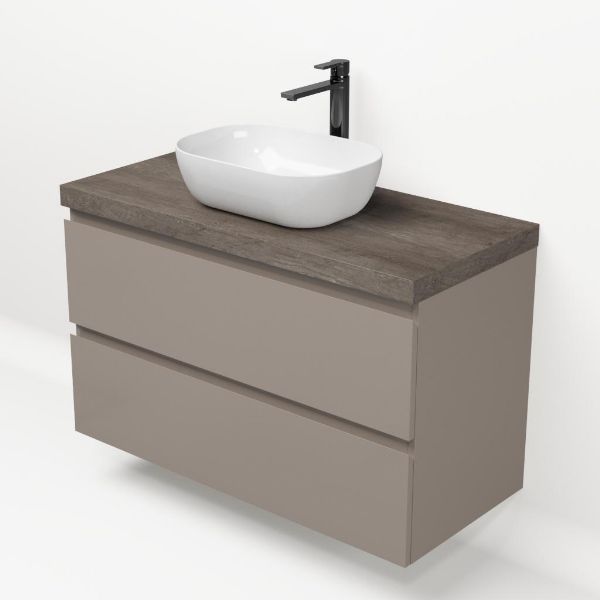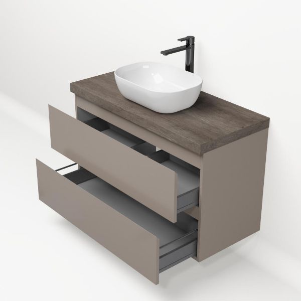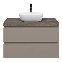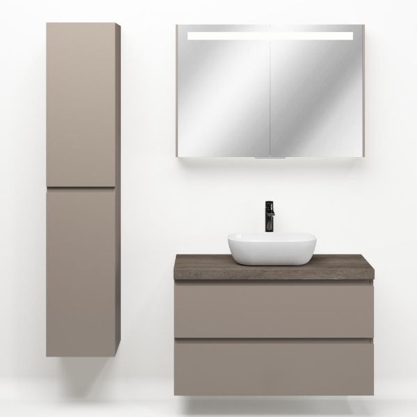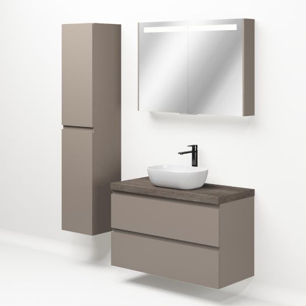 Greeploos badkamermeubel in de kleur taupe is 100 cm breed. Op het meubel ligt een afdekplaat met een gelamineerde toplaag of volledig gemaakt van natuursteen.