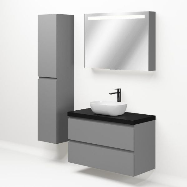 Greeploos badkamermeubel in de kleur licht grijs mat is 100 cm breed. Op het meubel ligt een afdekplaat met een gelamineerde toplaag of volledig gemaakt van natuursteen.