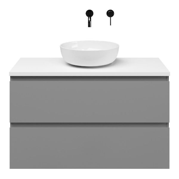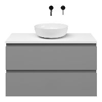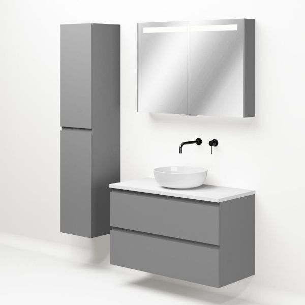Greeploos badkamermeubel in de kleur licht grijs mat is 100 cm breed. Op het meubel ligt een afdekplaat met een gelamineerde toplaag of volledig gemaakt van natuursteen.